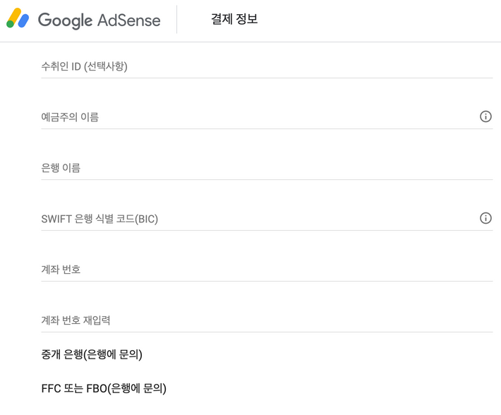 아래와 같이 애드센스 결제 정보 등록 화면을 보면 수취인 ID(선택사항이므로 입력할 필요 없음), 예금주의 이름, 은행 이름 그리고 SWIFT 은행 식별 코드(BIC)와 계좌번호를 입력해야 합니다.